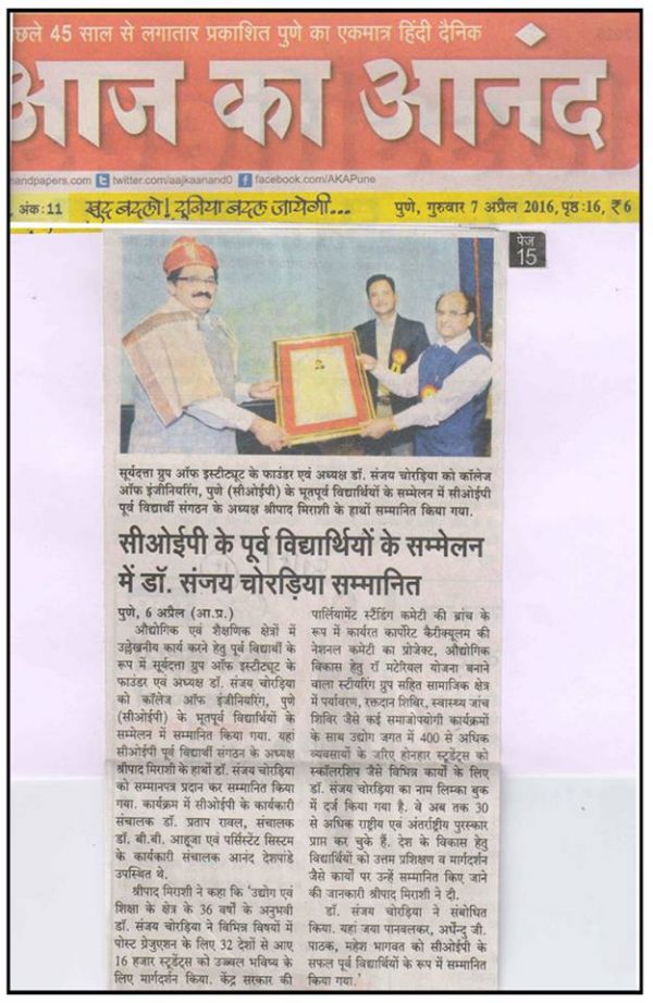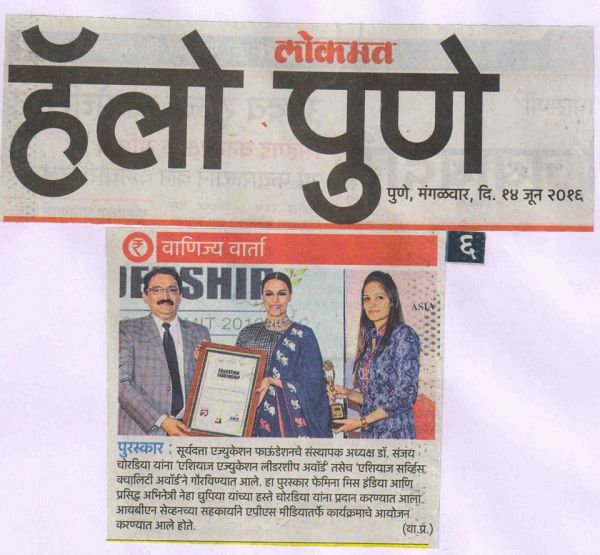 Professor Dr. Sanjay B. Chordiya, Founder President and Chairman and Mrs. Sushama S. Chordiya, Vice President of Suryadatta Education Foundation have been conferred with 'Savitri-Jyoti' Award by Rashtriya Bandhuta Sahitya Parishad, Rayat Shikshan Sanstha's Dr. Babasaheb Ambedkar College. The award has been conferred in recognition of quality education to the students since Suryadatta Education Foundation's inception besides, for the CSR activities organised throughout the year.