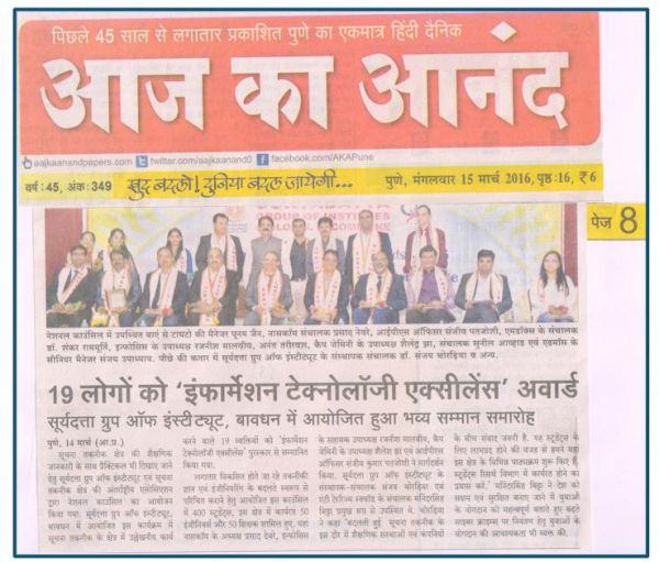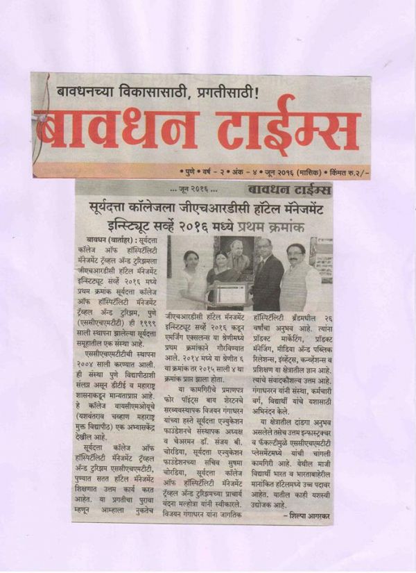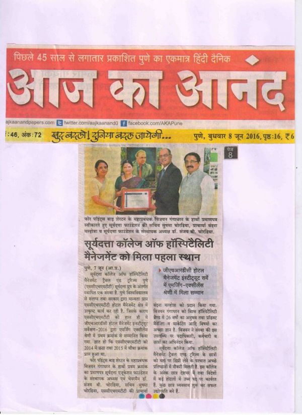 "SURYADATTA PUNE'S LEADING GROUP OF EDUCATION INSTITUTES feels proud to share that Certificate of Excellence and State Level Award 2021 has been Conferred by INDIA'S LEADING NAVABHARAT GROUP upon ‘Suryadatta Colleges of Management, Animation, Hotel Management, Fashion Design, Commerce, Cyber and Information Technology’ in recognition of Outstanding Performance and Premium Quality Work for ‘Most Innovative UG/PG College of Maharashtra in Emerging Sector’ by Navabharat Group Award -2021 Award'